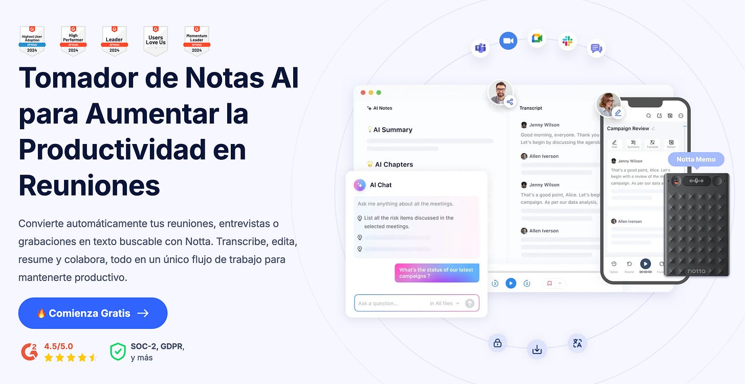 Notta no entra en la reunión. No se presenta. No saluda. Graba desde tu dispositivo, transcribe después y genera resúmenes. Funciona bien para dictados, entrevistas informales, reuniones pequeñas o pensamientos hablados.