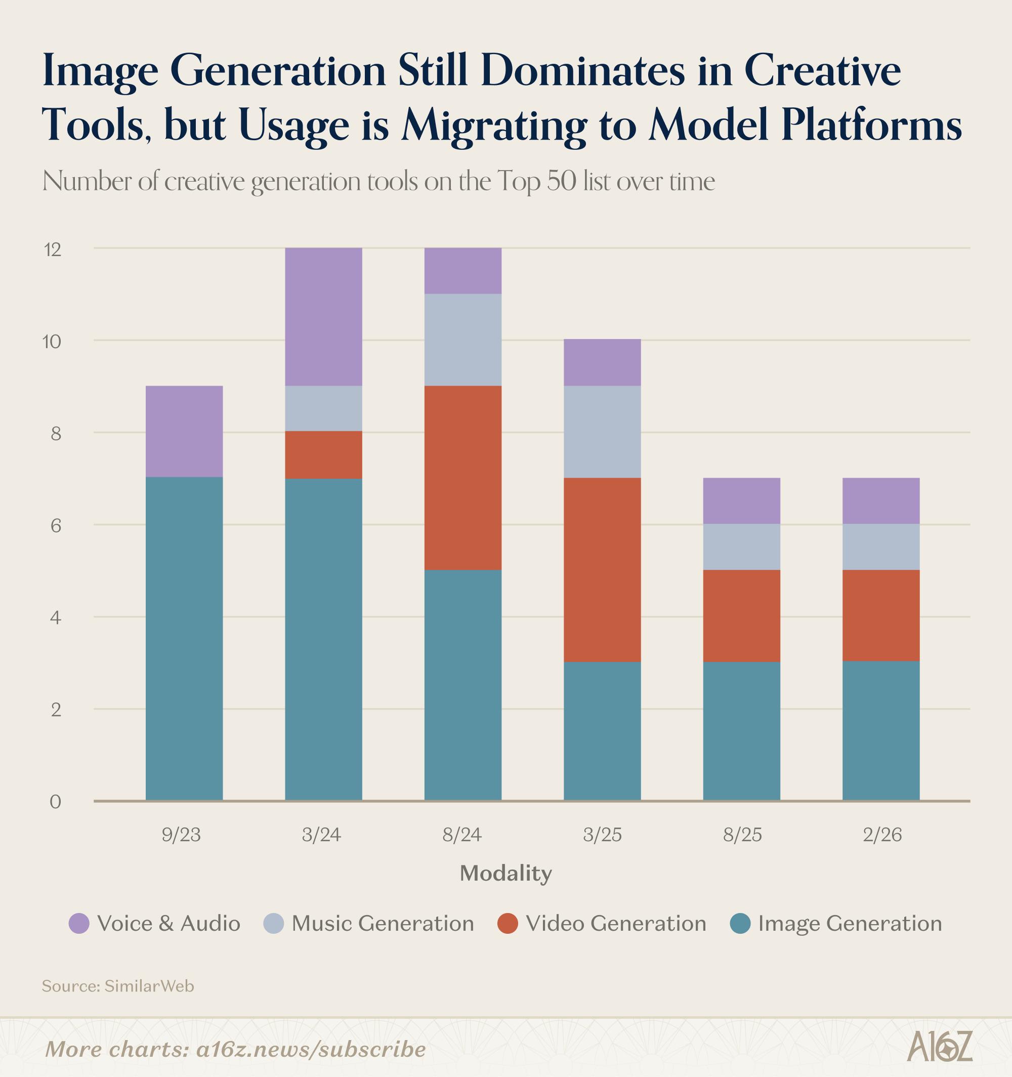 En la primera edición del ranking, siete de los nueve productos creativos en la web eran generadores de imágenes. Tres años después, solo quedan tres. Pero siguen apareciendo siete herramientas creativas. Lo que llena el hueco: vídeo, música y voz.