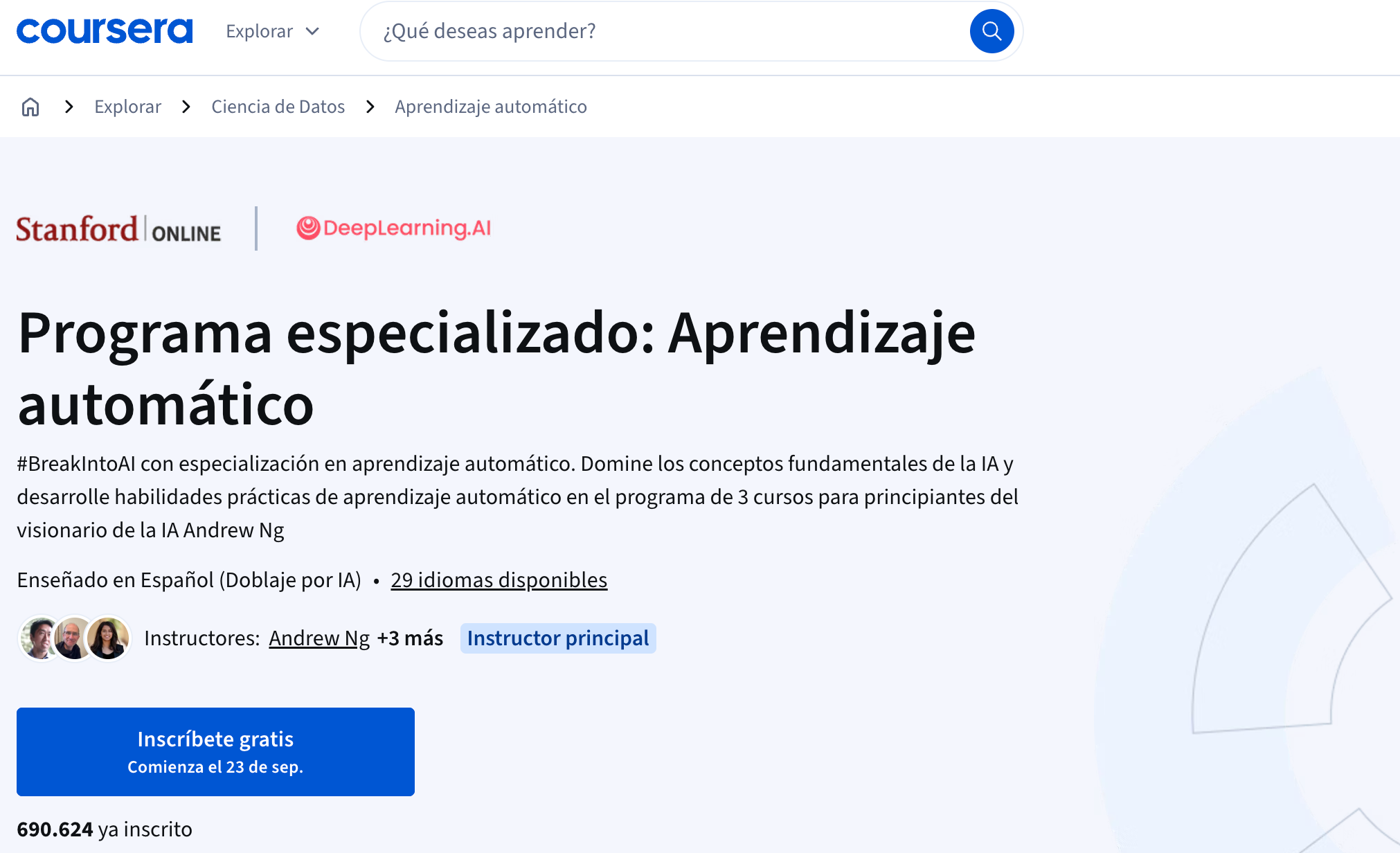 Y si lo tuyo es la paciencia y la técnica, Andrew Ng sigue siendo el maestro zen de la IA en Coursera. Su Programa especializado de aprendizaje automático es una trilogía fundacional. El que pasa por aquí sale con otra mirada: la de quien entiende que los datos no son números, sino relatos que la máquina lee a su manera.