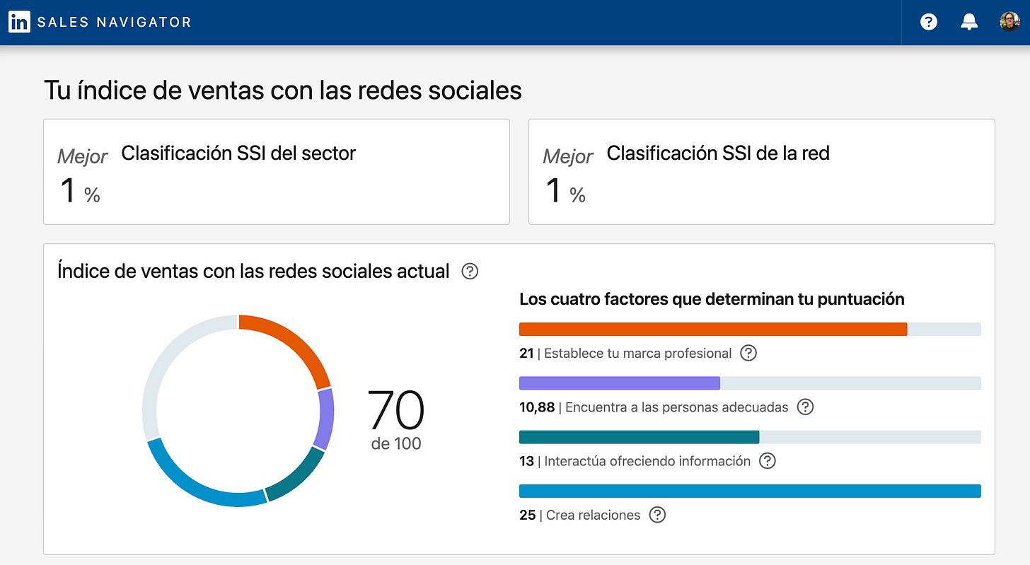 LinkedIn tiene su propio sistema de evaluación. Se llama SSI (Social Selling Index) y te da una puntuación sobre 100 basada en cómo construyes tu marca, interactúas, creas relaciones y usas la plataforma para vender(te).